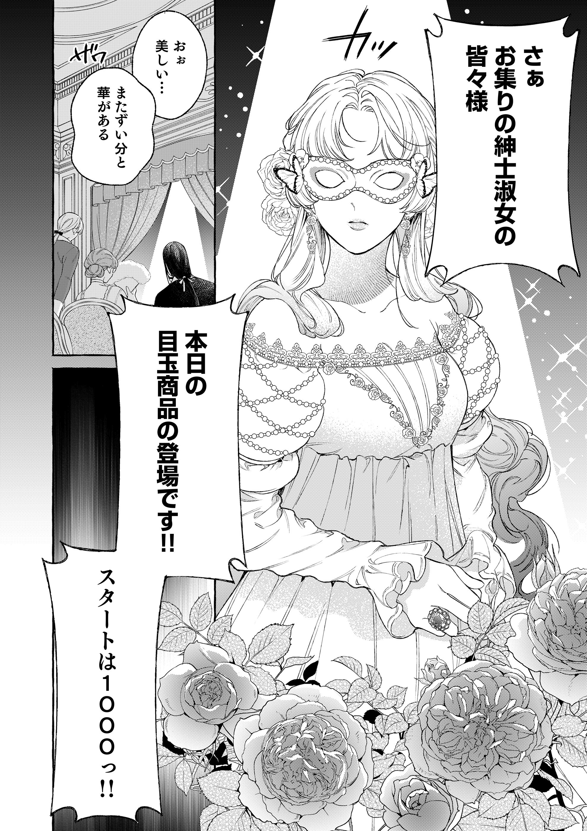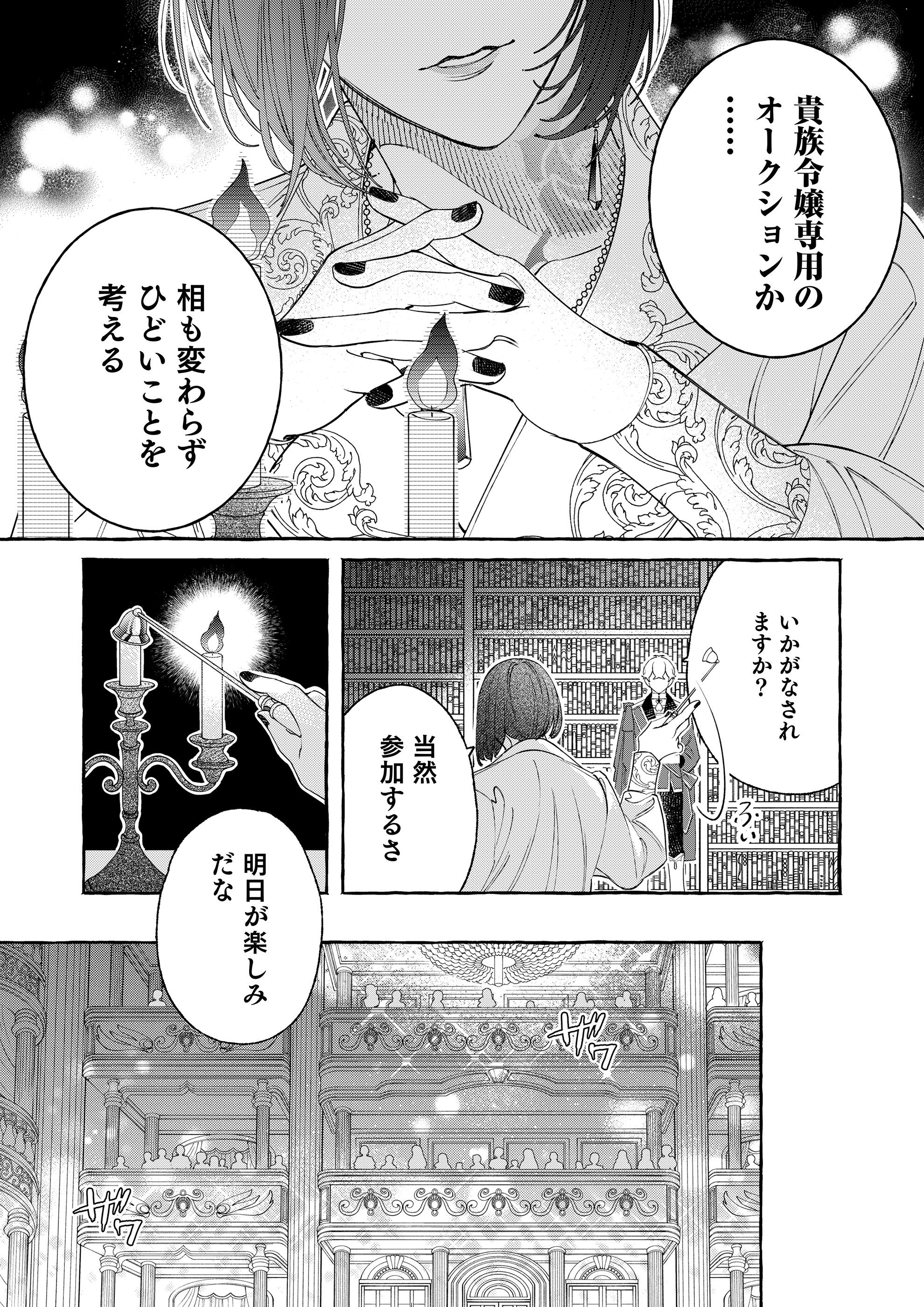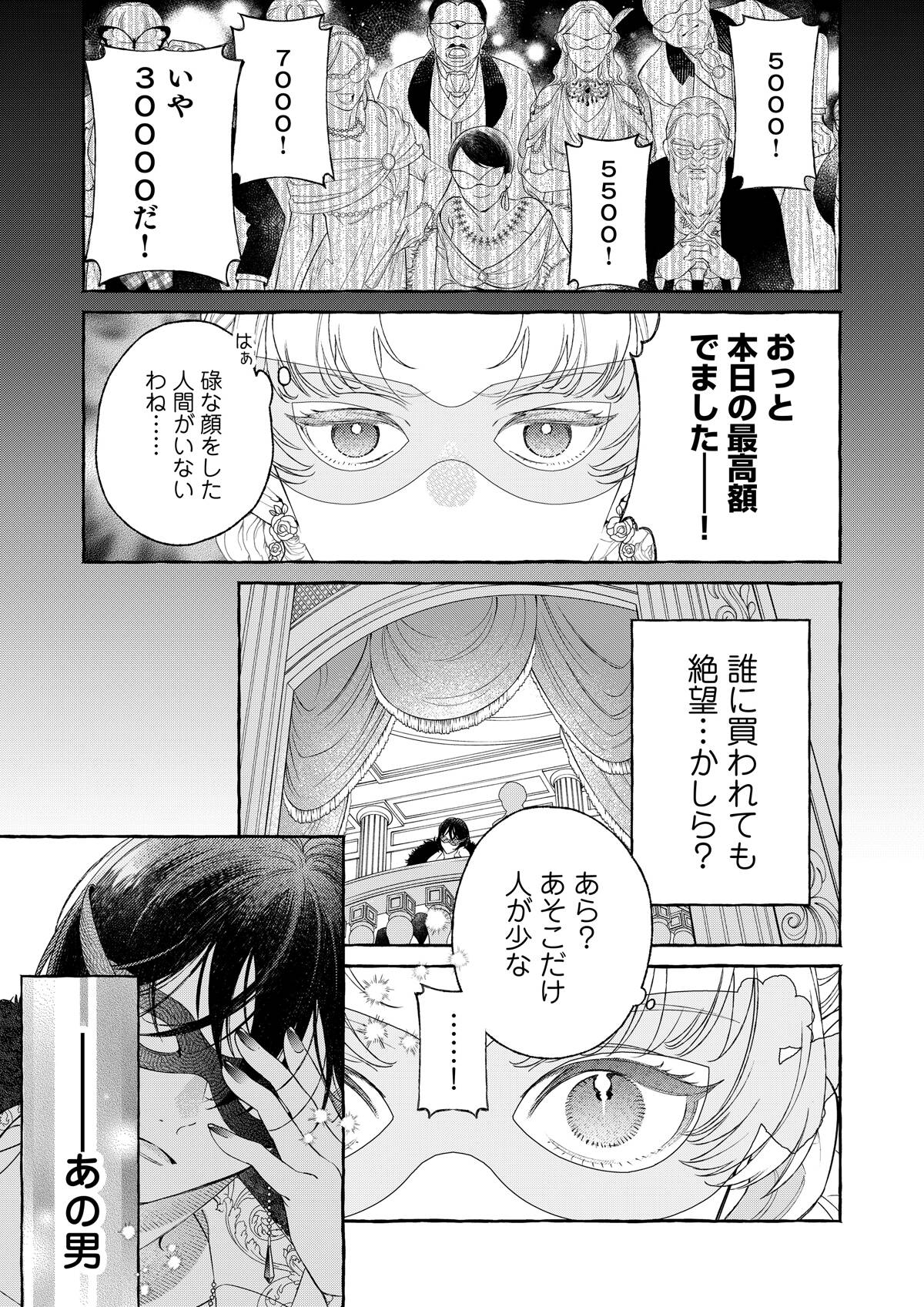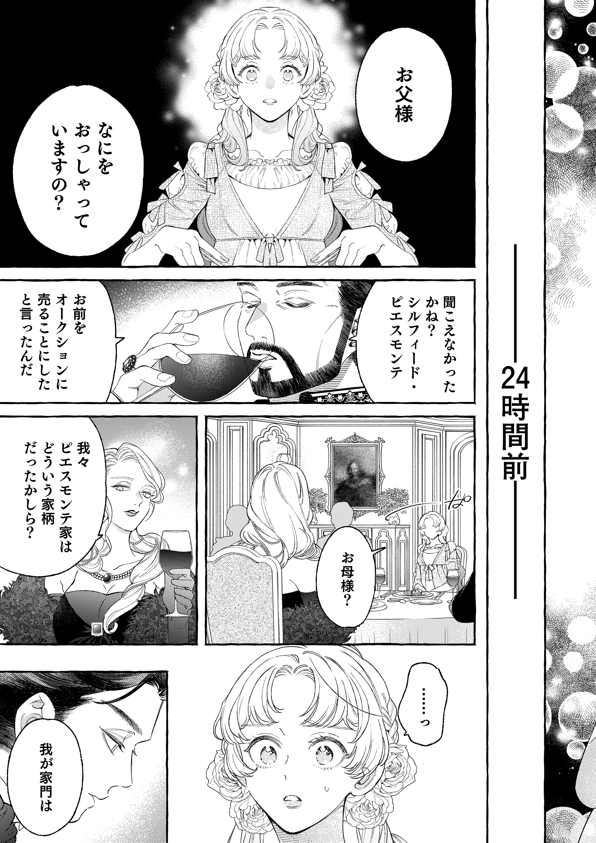 親の失敗の責任をとり、貴族令嬢専用のオークションにかけられたシルフィー。覚悟を決めて「うんと高い値につり上げさせてやるわ!」と着飾り、オークションへと向かう。――そこで出会ったのは、黒の王子・オーギュストだった。