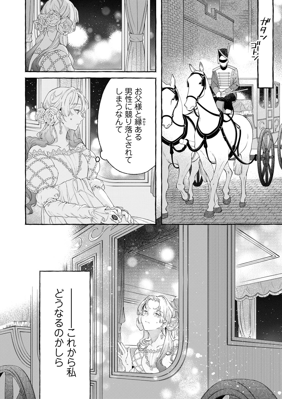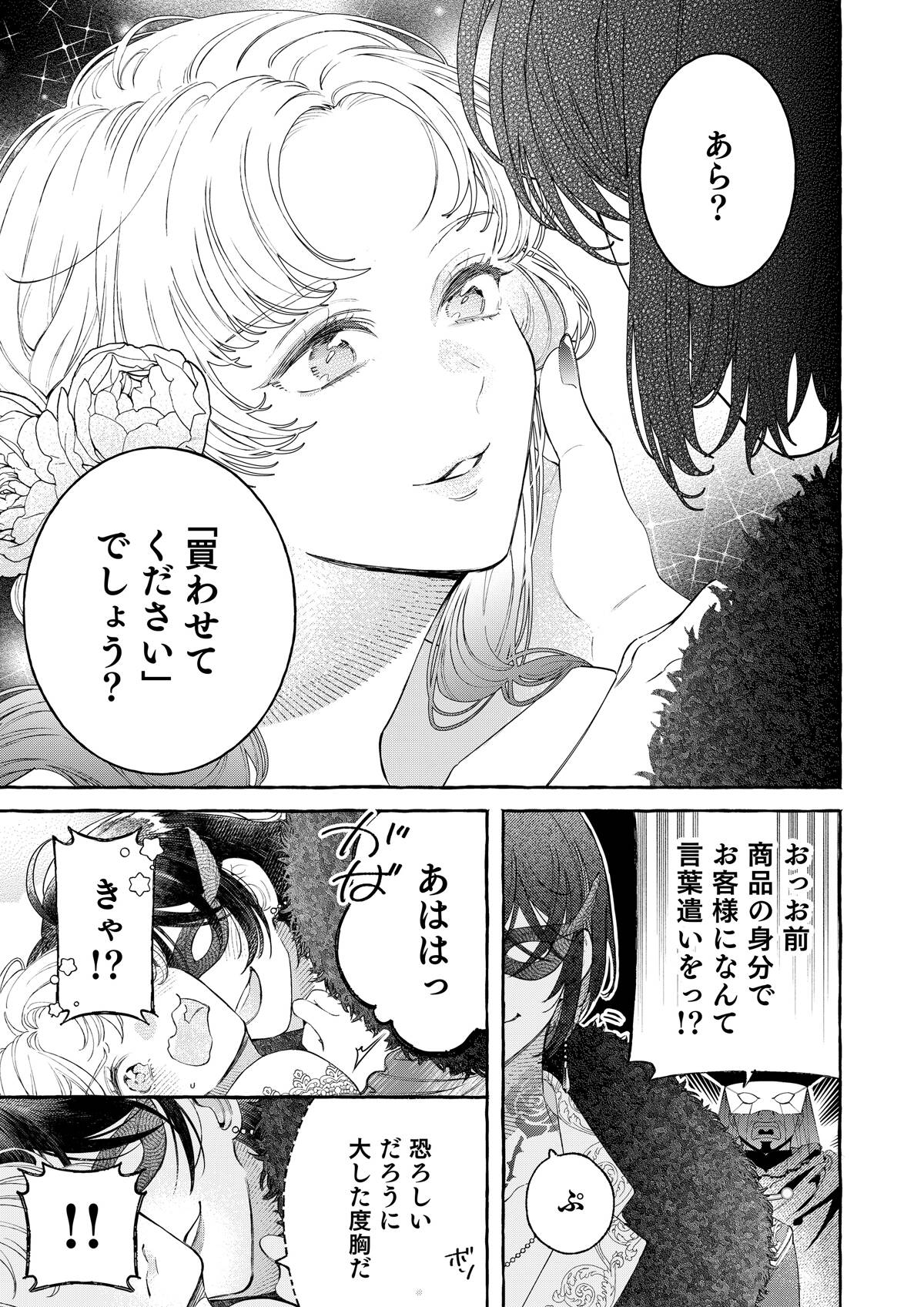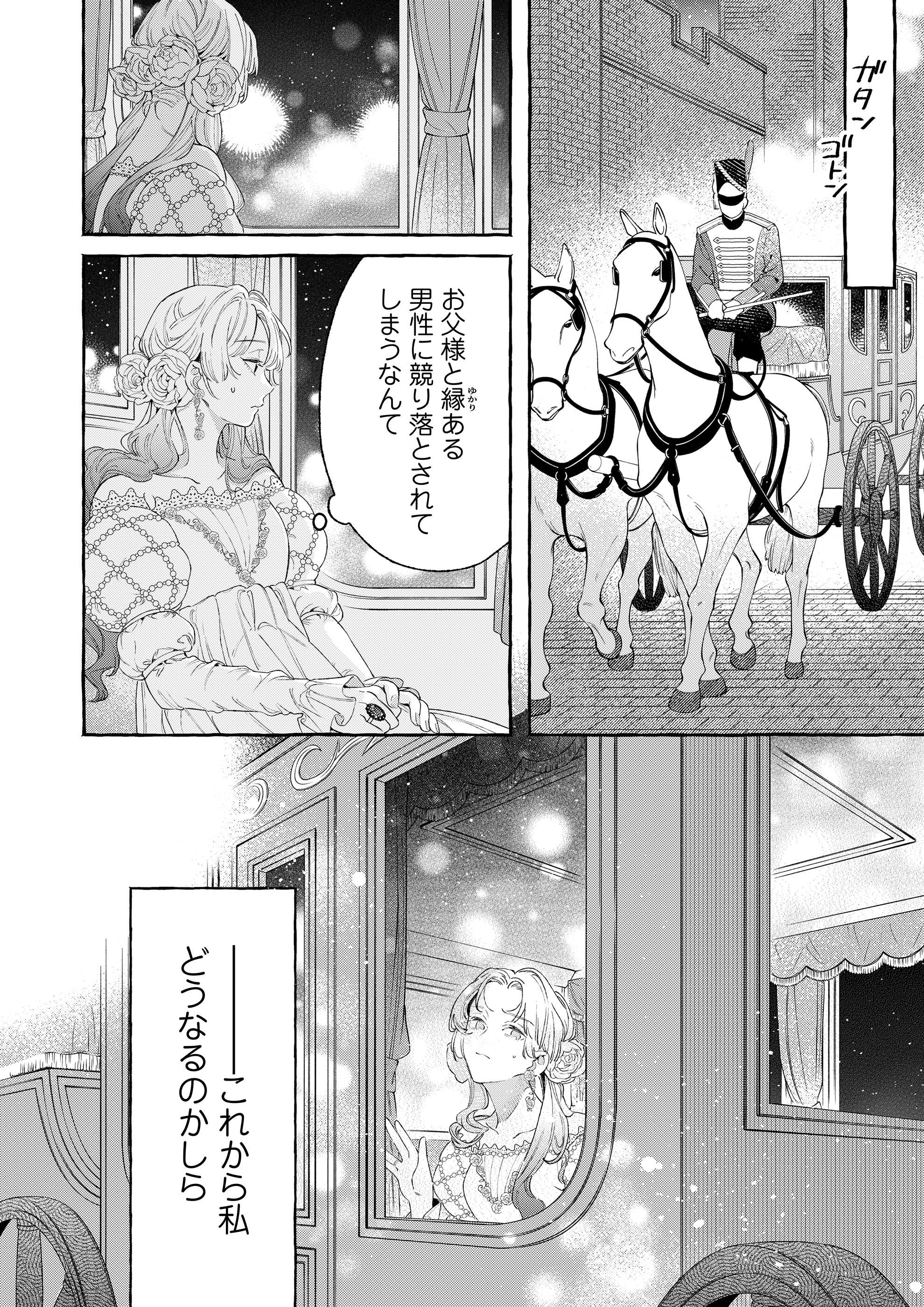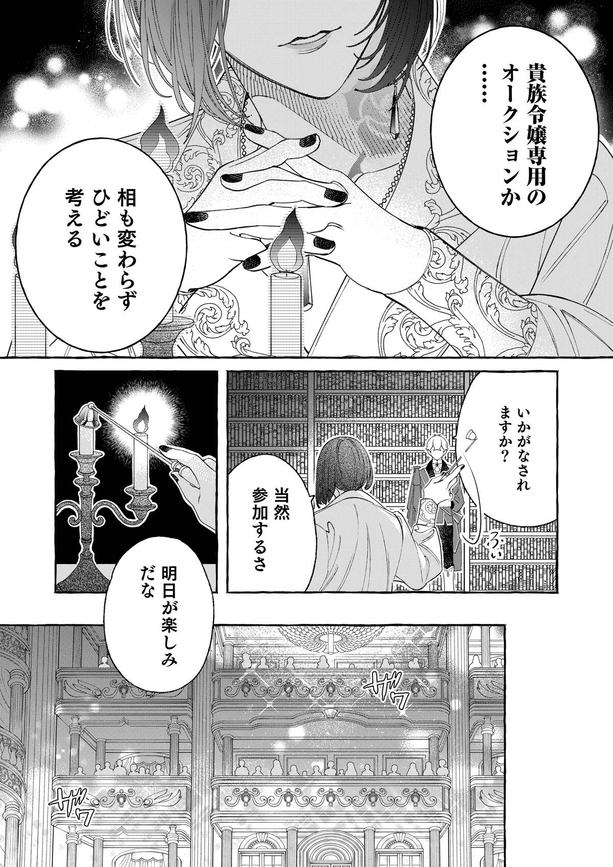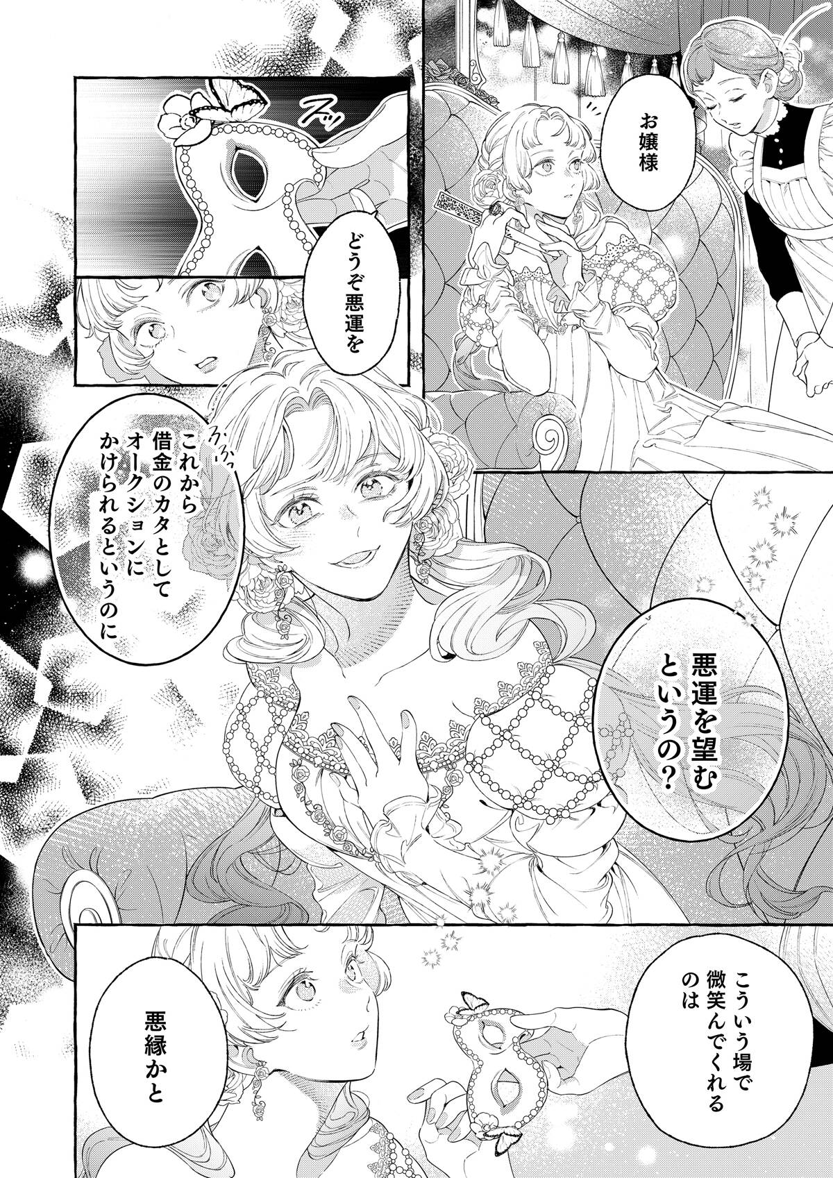 親の失敗の責任をとり、貴族令嬢専用のオークションにかけられたシルフィー。覚悟を決めて「うんと高い値につり上げさせてやるわ!」と着飾り、オークションへと向かう。――そこで出会ったのは、黒の王子・オーギュストだった。