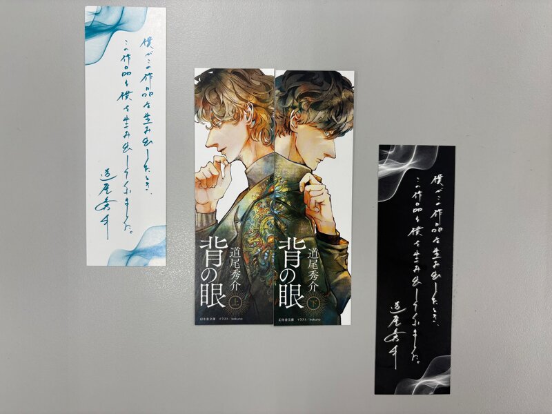 kokunoさんによるカバーイラストがしおりになり、裏側には、このためだけに道尾さんが書いてくださったメッセージが入っている。