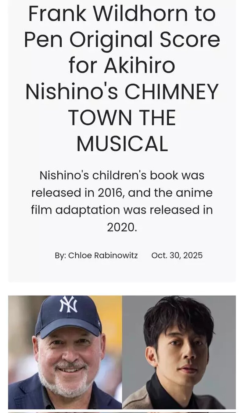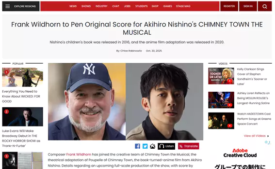 2025年10月30日。ニューヨークで、ミュージカル『Chimney Town the Musical』の プレスリリースが発表されました。(ブロードウェイ仕様で、ミュージカルのタイトルは、『Chimney Town the Musical』に、ゴミ人間「プペル」の名前は「Binny」になります )