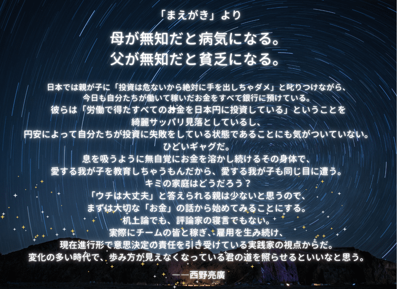 「僕がここで本に書かなかったら、日本は、重大な選択肢を失ったまま、この先、5年10年過ごすことになる」というのは、西野本人の言葉だ。
