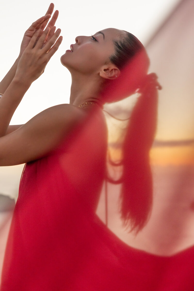 今回はこれまであまり見せることがなかったアクティブな一面も初公開。サーフィンを楽しむ姿や、海中でイルカと戯れるスキンダイビングシーンは圧巻。まるで人魚のように自由に泳ぐ彼女の姿に、カメラマンのシャッターを切る指が止まらず、最終的には撮影カット数は約1万カット超えに。