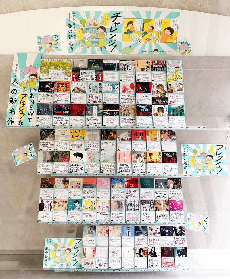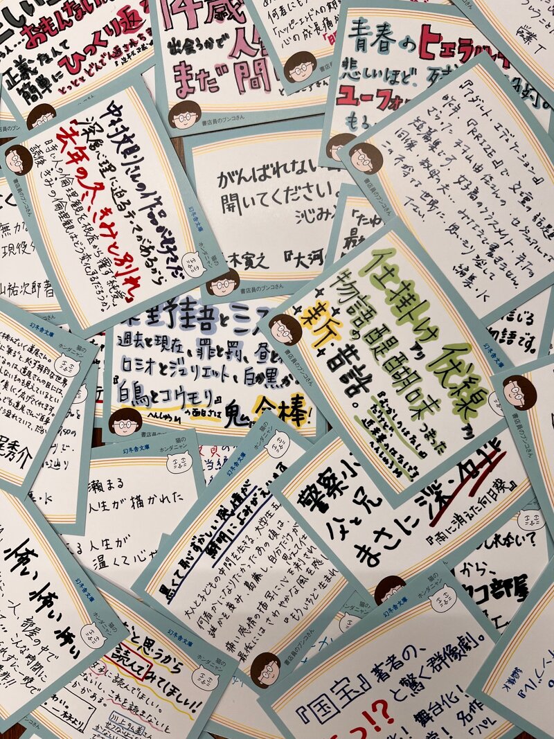 また、80作品すべてに”手書きPOP”を制作。一冊一冊に込められた熱い想いをそのままお届けします。幻冬舎文庫のアンバサダーを勤めるブンコさんとホンダニャン(©益田ミリ)と幻冬舎文庫の背の色であるブルーのフレッシュなビジュアルが目印です。